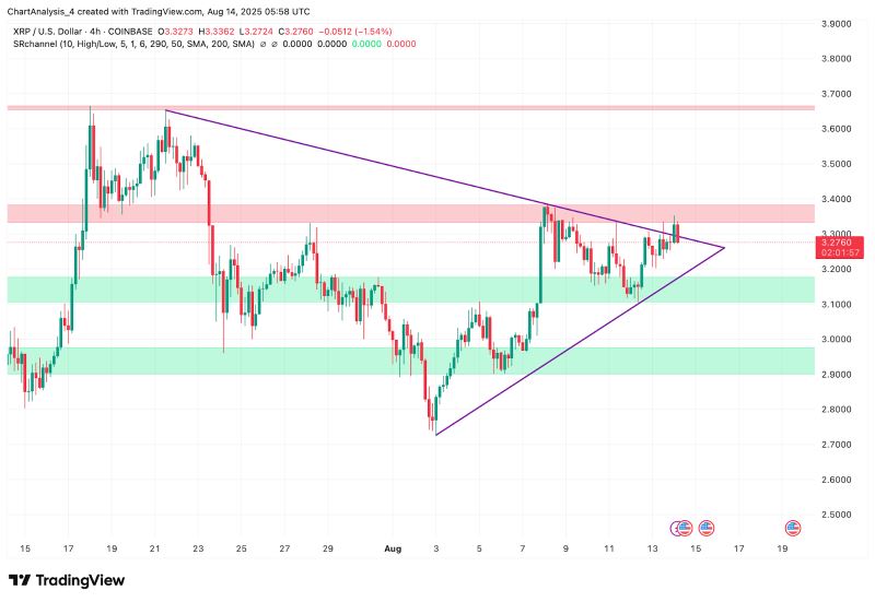 XRP 价格今日在 3.34 美元下方盘整,此前曾从 8 月初 2.72 美元附近的低点回升。市场目前正在测试一个重要的阻力区,同时交易于一个收紧的对称三角形内,这表明突破的迹象正在形成。价格走势仍高于多个 EMA 支撑位,而链上资金流出趋势略有减弱,暗示卖方压力正在减弱。