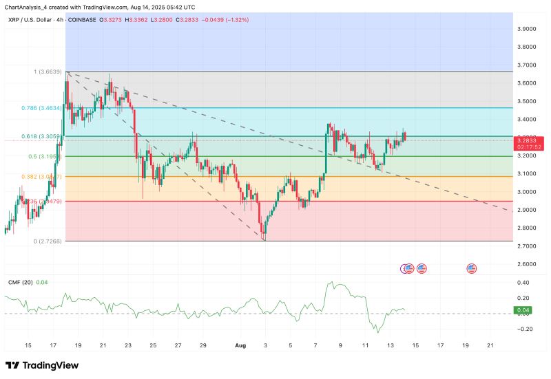 在4小时斐波那契回撤图上,XRP在收复0.618关口(3.30美元)后,目前徘徊在0.786关口下方(3.46美元)。0.50关口位于3.19美元,近期已成为看涨延续尝试的支点。Chaikin资金流(CMF)略微为正,为0.04,表明资金流入温和。