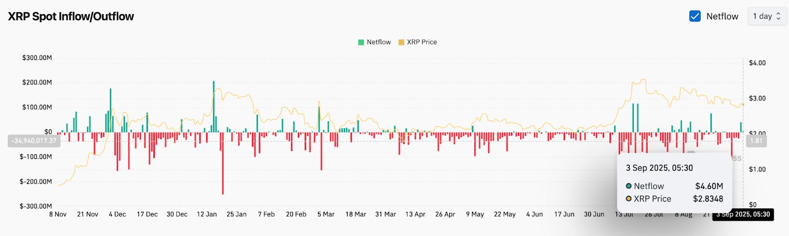截至 9 月 3 日,XRP 净流入量为 460 万美元(来源:Coinglass)