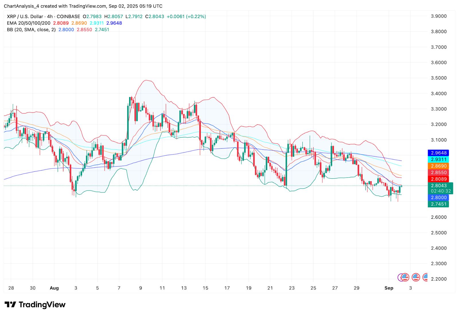 在 4 小时图上,XRP 价格走势自 8 月初以来呈现出明显的下降趋势线,20 日 EMA 和 50 日 EMA 分别在 2.82 美元和 2.89 美元处形成阻力位。100 日 EMA 和 200 日 EMA 分别位于 2.94 美元和 2.97 美元,形成了一个密集的天花板,买家必须突破该天花板才能恢复上涨势头。