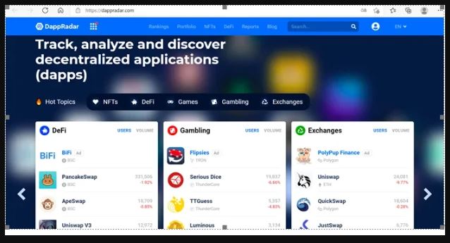 DappRadar是一个专供DApp数据查询的平台,汇聚业内各大DApp信息,国内用户可以直接浏览。首页分为游戏、DeFi、博彩、DEXs交易所、社交等几大热门板块。