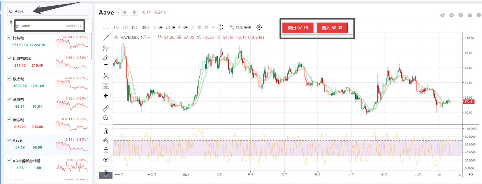 第三步:在搜索框输入“AAVE”,然后点击左侧弹窗【AAVE USD】,同时点击右侧【买入/卖出】