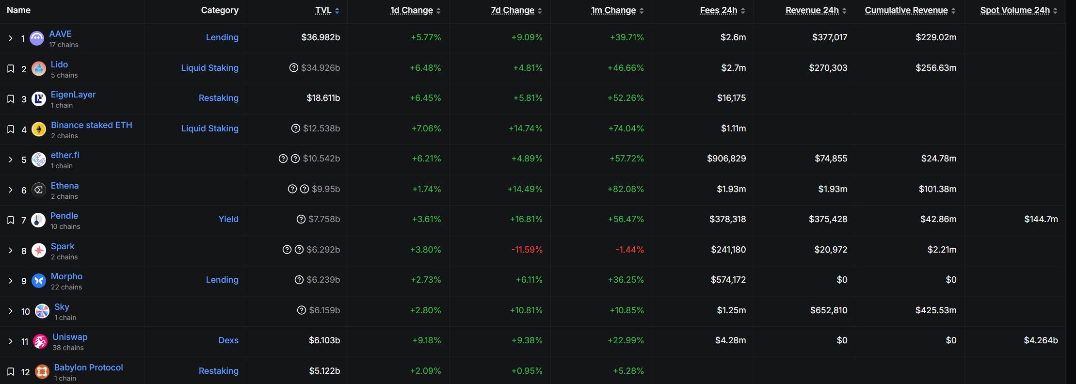 此外,据DeFiLlama数据显示,AAVE的TVL为369.8亿美元,在DeFi中排名第1名