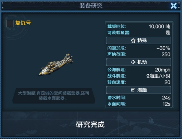 潜水时间:决定潜艇在水下隐藏的时间,潜水状态下仅能被水下武器攻击,时间越长理所当然优势越大