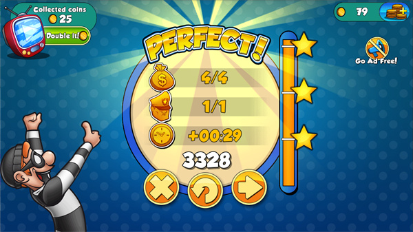 6、隐身高手躲开保安、居民和打盹的狗,搜刮每关的宝贝。用忍者功夫在监控下藏好别露馅。
