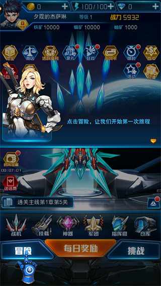 当我们进入游戏选择好了我们的战机之后,我们就可以开启冒险了,直接点击冒险即可。(左下角)点击之后选择我们需要进入的章节,然后点击出击。