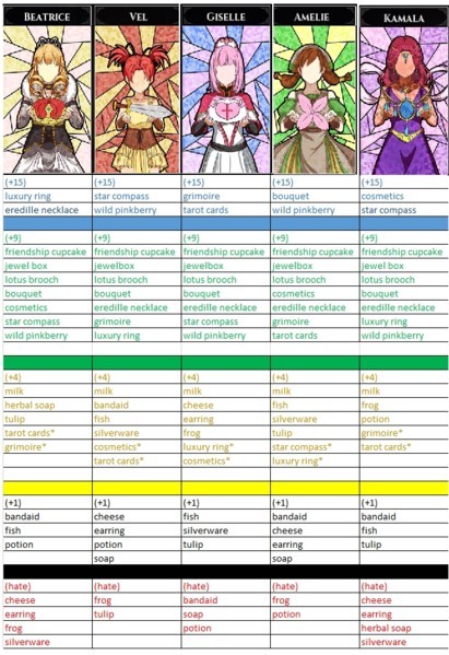 你可以假设每个人都喜欢Serena的所有奢侈品商店的物品,但每个女孩都有2件奢侈品,她们只对其无所谓火鸟之羽、哲学家之石和湖中女神之鱼都是通用的+100分。现在,得到它们似乎是一个完全随机的机会。然而,它们的掉落点总是相同的。哲学家之石:城堡之狗(这是一个fma参考orz)火鸟之羽:医务室抽屉(有道理,因为它是一只凤凰的羽毛)湖中女郎的鱼:郊外钓竿爱之笛普遍给出了高达500分的分数。有一点需要注意的是,它不会立即结束你的游戏过程,所以你不必担心在给它时错过任何特殊场景......除了可能是聊天选项。请记住,连续两次给一个女孩同样的物品,对爱的回报会越来越少(通常是通常的一半),所以你需要尽可能多的种类,特别是在挑战模式下!你的状态也是影响爱情的一部分。你的状态在礼物赠送中也起到了一定的作用!每个女孩都有一个她们喜欢的状态,你可以得到相当于该状态一半的奖金,好的礼物。另一方面,当你送出喜欢的礼物时,你会得到相当于该状态的奖金快速浏览每个女孩的偏好状态,至少在礼物方面。比阿特丽斯。魅力维尔。力量吉赛尔:智力艾米:智力卡马拉:力量生日似乎对送礼没有任何奖励作用。然而,如果你在一个女孩的生日那天送给她一件喜欢的东西,你会得到特殊的对话。