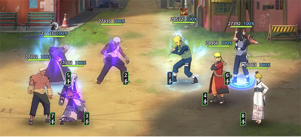 第一回合,三船奥义敌方大蛇丸【青年】,遭到波风水门【青年】的打断。之后双方各自普攻,从图中可以看出,虽然我方佐助【须佐能乎】血量很低,但敌方的波风水门【青年】在我方忍者的多次普攻以及追打后战败,所以我方可以在第二回合实现四打三。