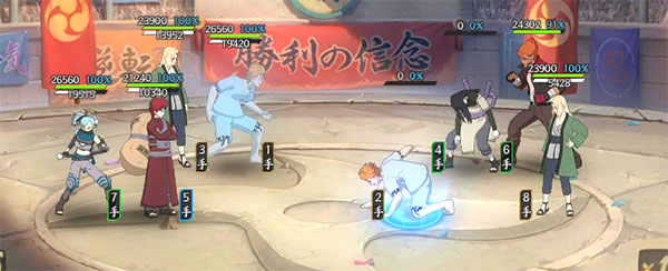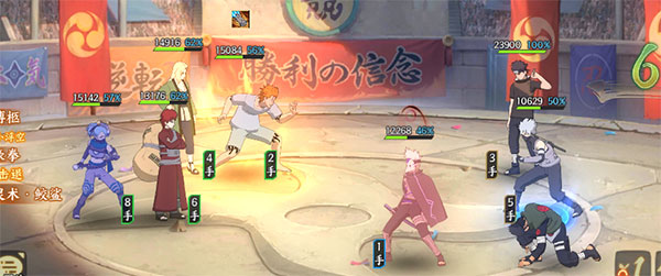 第二回合,由于敌方艾【四代雷影】无法释放奥义,我方奥义盯着敌方进行打断即可,在水主的回复下,我方普攻更占优势。双方普攻结束,可以使用水主奥义回复部分血量。