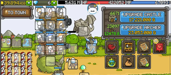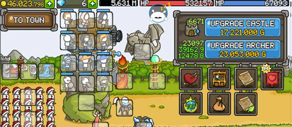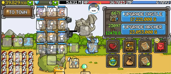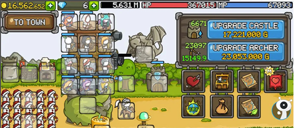 1、进入成长城堡游戏后,可以升级城堡和升级普通弓箭手来提升战力。