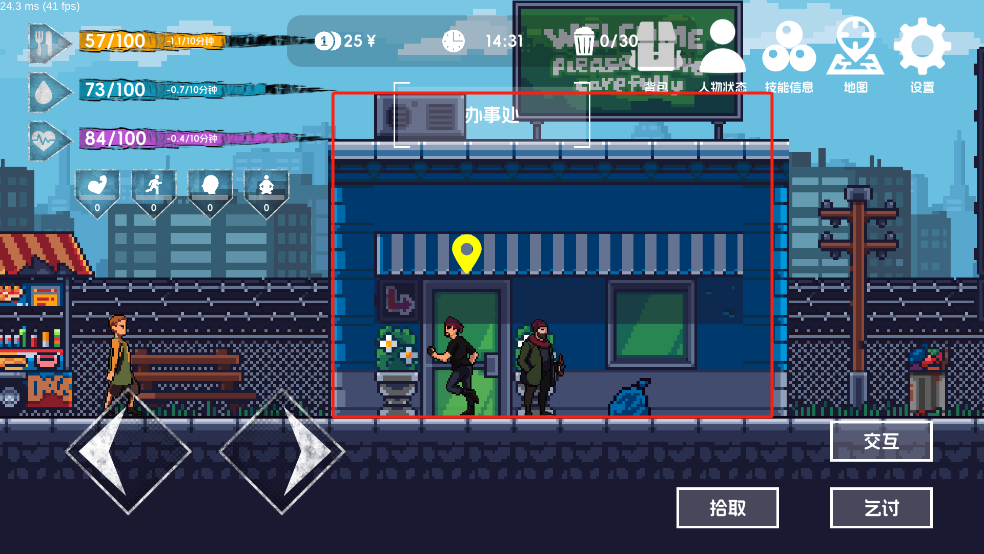 流浪者2破解版内置菜单手游采用的是复古像素风格的生存模拟游戏,在这里玩家将扮演一无所有的流浪汉,在复杂的都市中艰难谋生。游戏通过四大核心属性系统,体格、身手、智力和精神,以及超过三百种特性技能,构建出了一个高自由度的生存体验。每一次选择都将影响生存进程,无论是靠勤劳工作赚取收入,还是运用策略在街头求生,都需要谨慎权衡。随着属性提升和技能解锁,玩家能够以更高效的方式应对饥饿、疾病和突发事件,体验从底层挣扎到逆袭人生的完整历程。如果你喜欢充满挑战的模拟经营游戏,不妨下载尝试这段充满现实感的都市生存之旅吧!