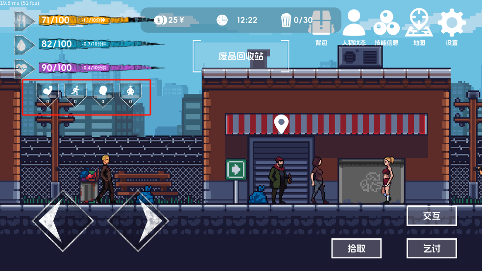 7、在进入夜晚后(21点)会消耗大量属性,如果是在户外则很有可能会在黑夜中倒下,所以请选择在收容所或者宾馆吧。