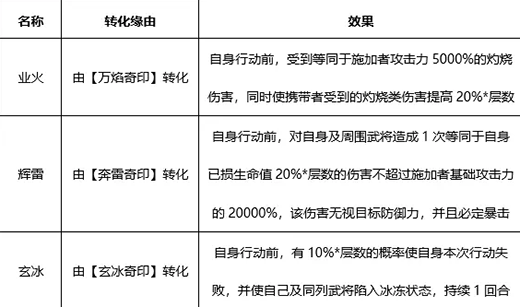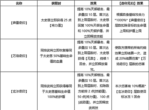 对敌方全体13834%的天御伤害,并伴随【奇印无归】效果,消耗不同的奇印对应不同的效果有小伙伴表示技能过于复杂了。仔细看也不难理解太史慈的技能,就是以奇印为核心进行的搭建。任意敌军同时被施加三种奇印,太史慈就会无消耗的释放一次武将技,且不消耗奇印。至于太史慈各种奇印效果具体总结如下: