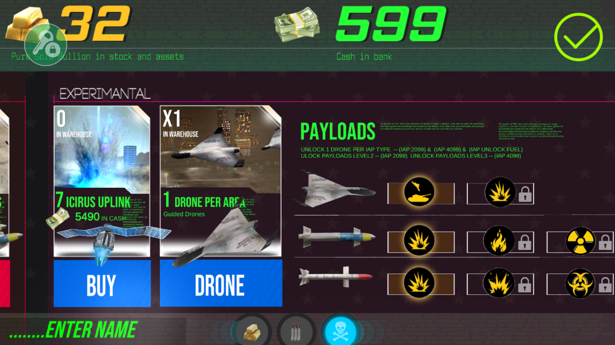 3、在沙漠、工业区、城市、荒地及无人区搜寻并追击敌人…利用战场试验新武器,发动攻击彻底消灭目标!将沙漠化为核冬天!无一幸免,尽情开火!炸弹与核武器已就位…摧毁城市以提高杀伤率,从政府获取积分,为您的核轰炸机订购更多装备、超级武器、太空武器及补给,体验核爆与烈焰火球的震撼!坚持抵抗。