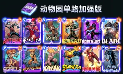 这套牌就没有在铺场buff的思路上all in,而是选择带了壮汉和刀锋的组合,还有钢铁侠,去在某两路获得更大的战力。3路平铺的能力不如上面的经典版,但是胜在可以在其中2路通过壮汉和钢铁侠来达到一个比较爆炸的效果,从而战胜更接近3路平铺的经典版动物园。