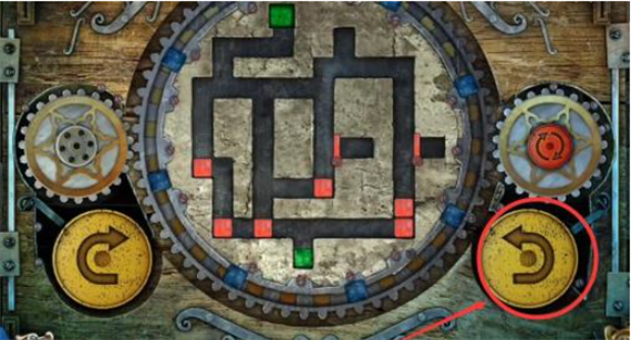 17、最后,点击左边黄色的旋转按钮一下,中间的大齿轮会顺时针旋转一次,旋转后的立方体位置如图,此时的绿色立方体已经进入了绿色的单元格内,即可通关,门就打开了。