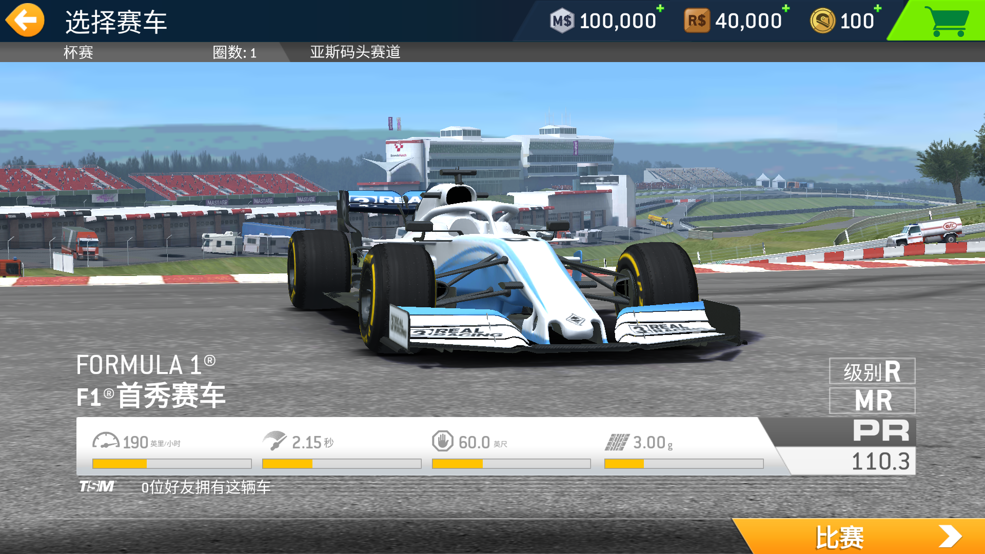 3、在车库中挑选心仪的赛车,并查看对应的性能参数与车辆信息。