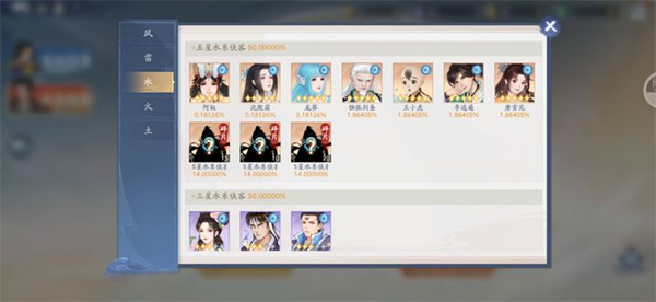 附上一张水系稀有度图片,前三个是相对稀有的,但是龙葵的技能不是冰冻,虽然强力但是跟其他侠客不是很搭,所以这里未做推荐,后四个获得难度适中,至于三个紫色则只有雷元戈值得,大家可以根据自己抽到的卡来合理调配阵容,不用强行靠,星多也是战力的一部分