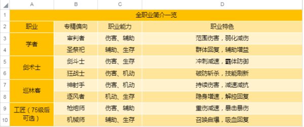 职业在75级时可开启专精方向,方向特色为大家做了总结,整体可分为输出和辅助,细节上也各有不同,大家可以根据自己的需求选择适合的职业。
