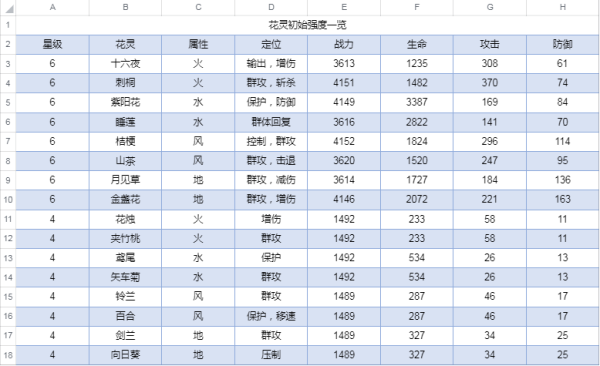看得出来4星和6星花灵的数据差值还是很大的,4星花灵的满破最高只能达到10星,限制了4星花灵的上限,因此除非有厨力,还是推荐大家重点培养六星花灵。