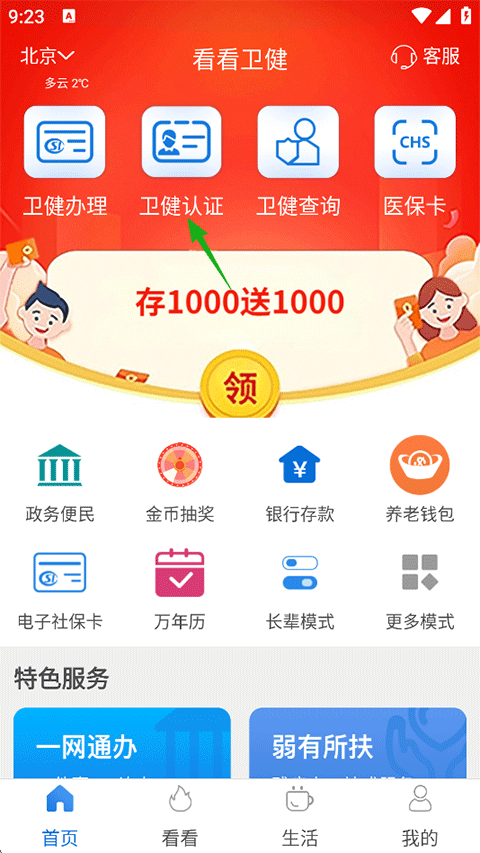 1、打开看看卫健APP,点击首页-卫健认证;