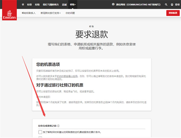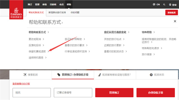 1、在 浏览器 上输入阿联酋航空官网(https://www.emirates.com/cn/chinese/),在官网首页点击帮助——联系我们;