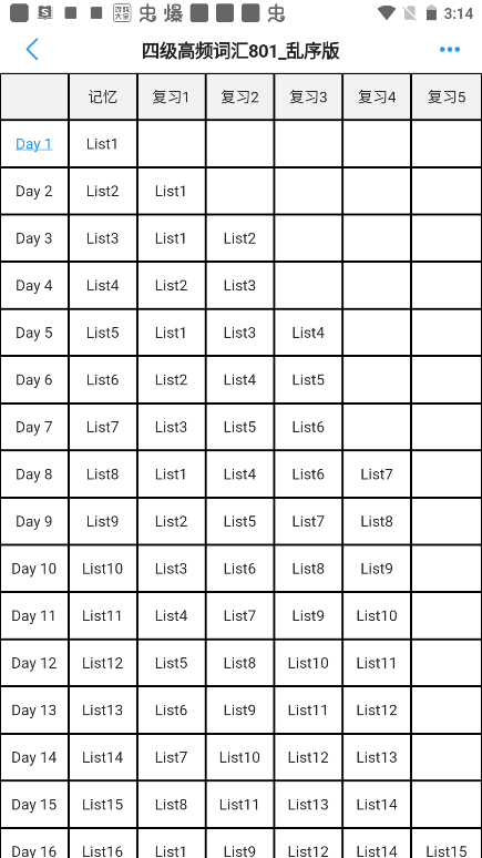 答:每个Day的学习由`记忆`和`复习`两部分组成,Day2里有List2记忆和List1复习,两个都完成“打卡”,顶部的向右箭头就可以点击,切换到Day3。