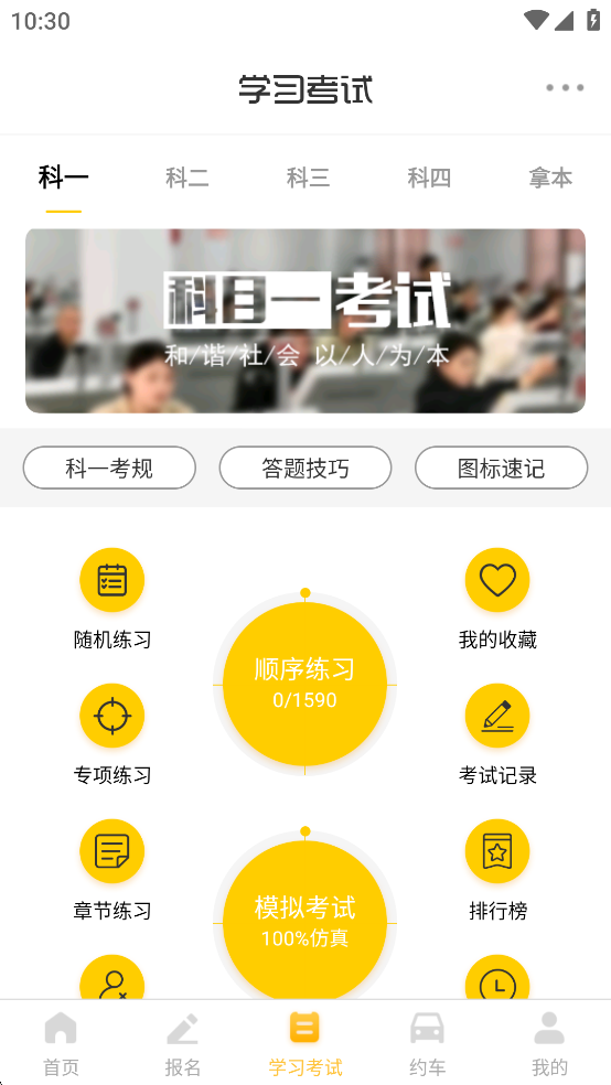 为学员提供科目一和科目四理论学习,各种训练模式,包括顺序练习,随机练习,强化练习和专项练习功能,具有错题收藏功能并与云同步,保证在不同的手机上都能够看到自己做过的题。