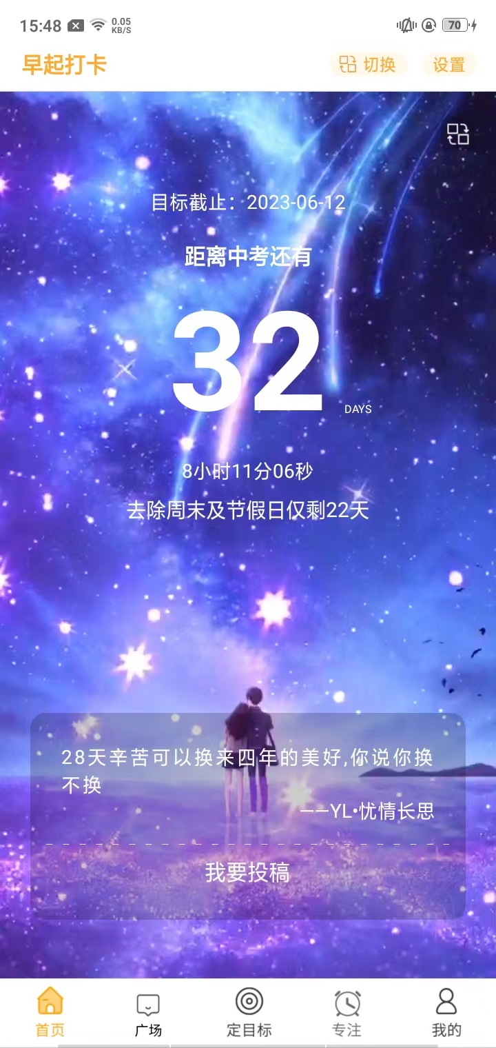 在中考倒计时app中用户可以设置中考、高考等重要考试的时间节点,软件会自动扣除周末与节假日,精准计算剩余备考天数,助力用户科学规划学习进度。同时首页每日推送励志格言,为紧张枯燥的备考生活增添一抹温暖与动力。而且用户既能搜索关注的问题、发布分享内容,也能查询各类实用学习方法,涵盖学习专属技巧、课程规划、考试必备攻略、寝室好物推荐、课余娱乐建议等内容,全方位提升学习效率。此外,软件支持定制个性化学习目标,通过目标督促培养良好学习习惯,持续激发备考动力。有备考规划需求的用户,赶紧下载体验吧!