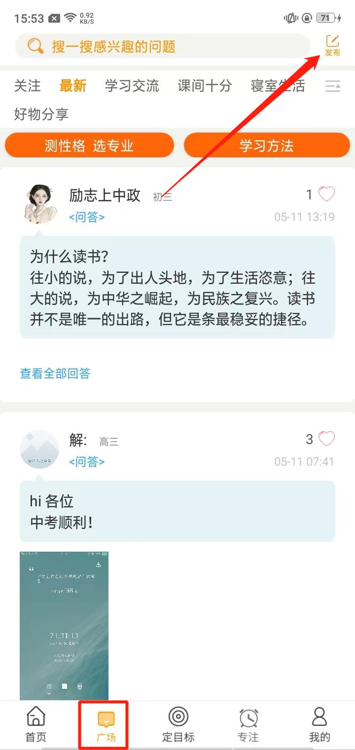 4、用户可以在广场上发布自己信息,点击下方功能栏的【广场】,然后再点击上方的【发布】,就可以输入自己想要发布的信息内容;