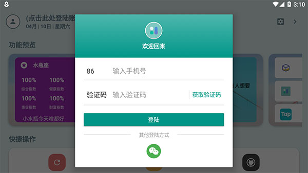 2、在首页中你可以看到各种各样的功能模块,而点击首页左上方的头像标志,输入手机号码和验证码,或者点击 微信 即可一键登录。