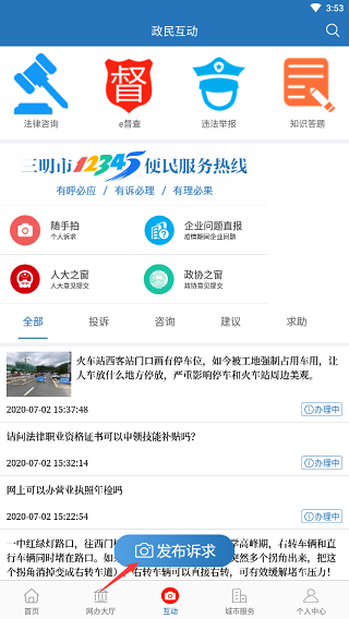 依托12345便民服务平台,统一公众诉求渠道,实行7*24小时服务,实行有奖“爆料”,用积分奖励鼓励市民参与城市管理。设置“随手拍”功能,市民可提交诉求、举报、提供违法违规、突发事件线索等。
