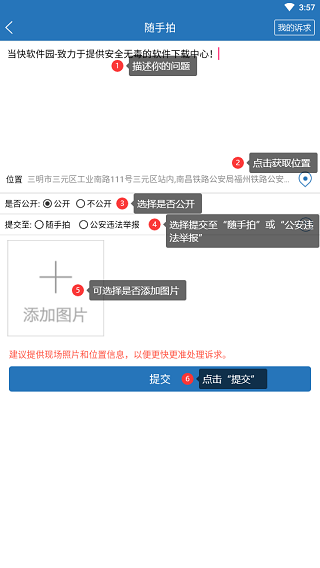 2、完成你的问题描述后获取位置,点击选择是否公开和投诉类型,当然你也可以上传问题图片