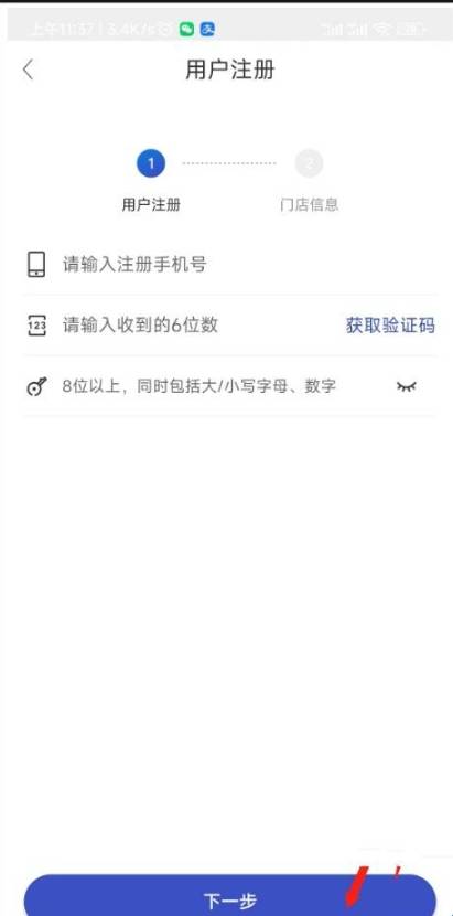 2、进入【用户注册】界面,依次填写【手机号】、【验证码】和【密码】后,选择下方【下一步】选项,