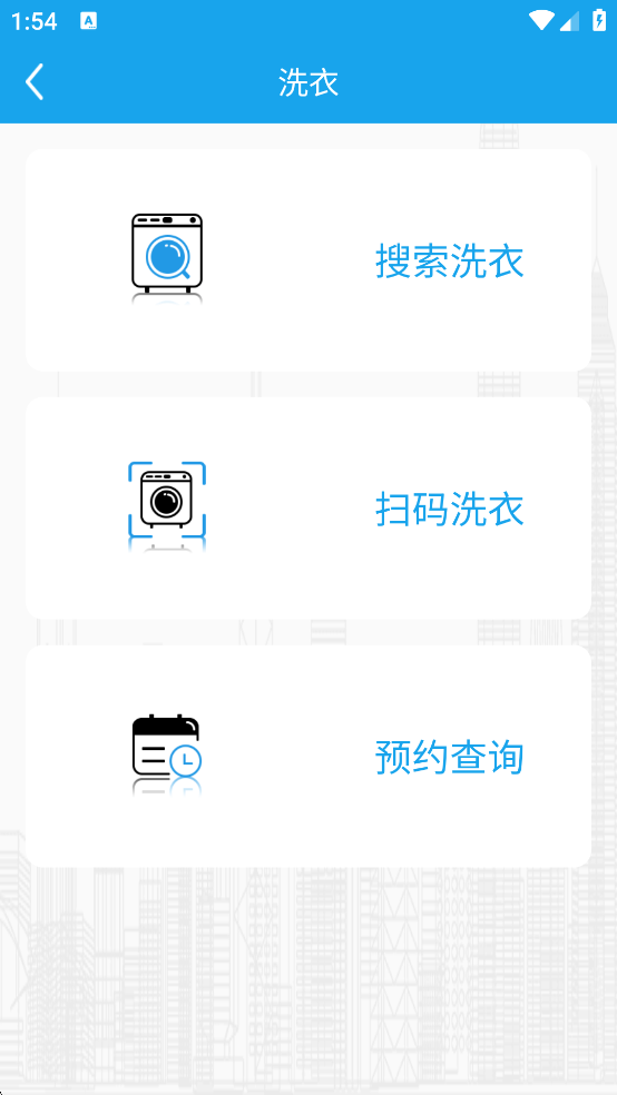2、选择连接设备的模式,“搜索洗衣”或“扫码洗衣”或“预约查询”
