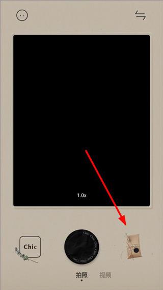 1、打开chiccam拍照软件,进入主页,可以拍照片或者拍视频,右侧是拍照主题;