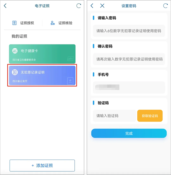 4、添加完成后返回电子证照页面,此时“无犯罪记录证明”添加成功,选择此证明,进入密码设置页面。根据提示输入设置亮证密码、输入手机验证码。