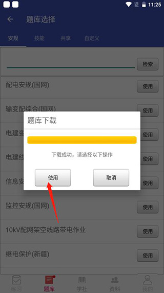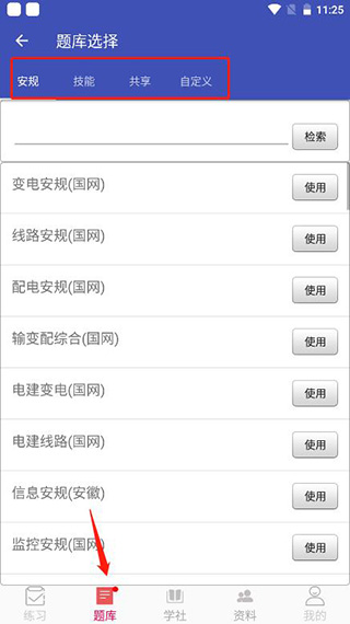 1、点击题库,这里带来了安规、技能、共享、自定义等分类,里面有各种题库;