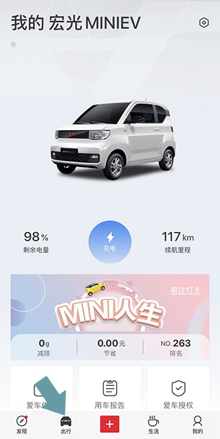 2、在“出行”界面,点击下方用车报告