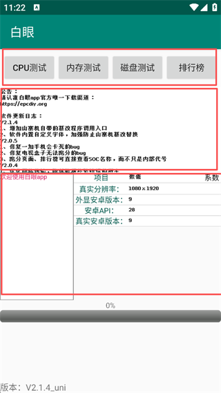 白眼是一款简洁而功能强大的手机检测工具,帮助用户精准了解手机硬件的真实状况。安装后,主界面一目了然,分为三个区域:菜单栏、公告栏和检测结果显示栏,布局简洁直观。