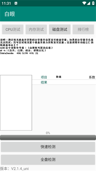 5、磁盘测试:通过填充磁盘的方式测试手机真实储存空间。