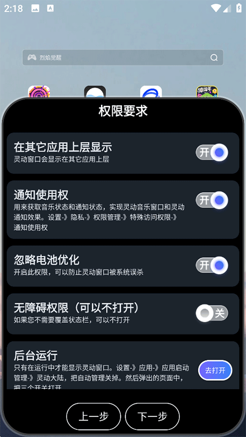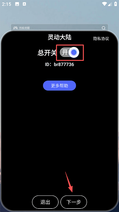 1、打开灵动大陆App即可开启总开关,点击下一步;