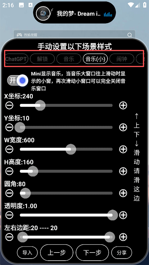 2、在上方预览各个插件的灵动岛效果,下方调整灵动岛的坐标位置、宽度高度、形状透明度边距等,继续下一步;