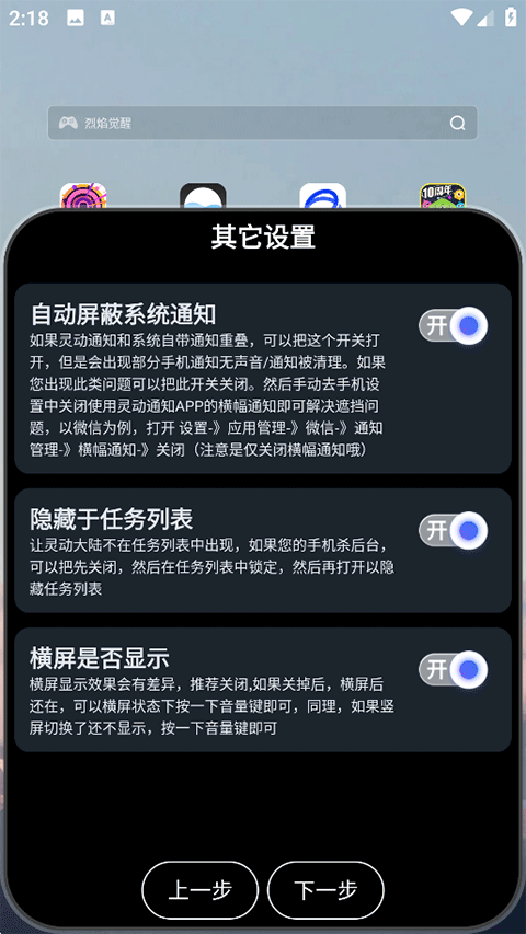 4、其他设置:如自动屏蔽系统通知、隐藏于任务列表、横屏是否显示,继续下一步;
