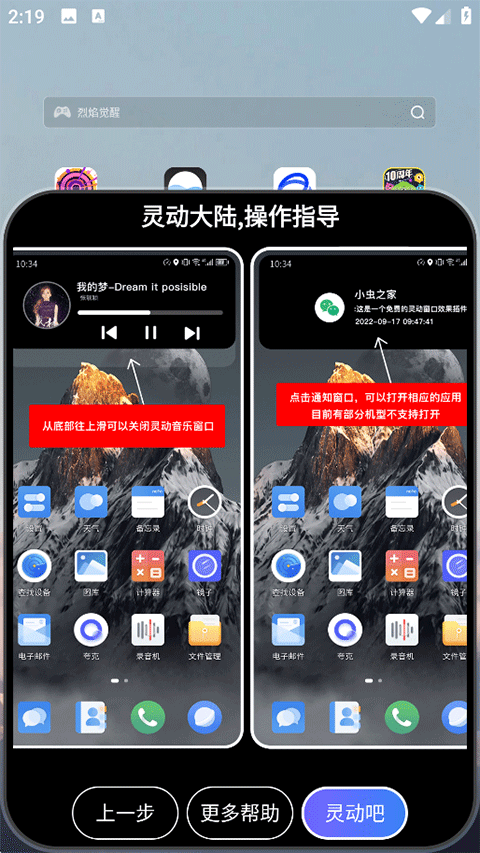 5、查看下方灵动大陆操作指引,最后点击灵动吧开启灵动岛体验。