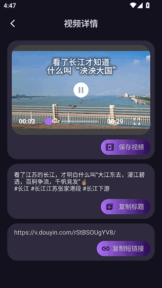 1、首先这软件所有功能完全免费,软件中没有登录和付费渠道,使用也很简单,例如你复制抖音上的视频链接后再打开这个软件就会识别链接中的方案和视频